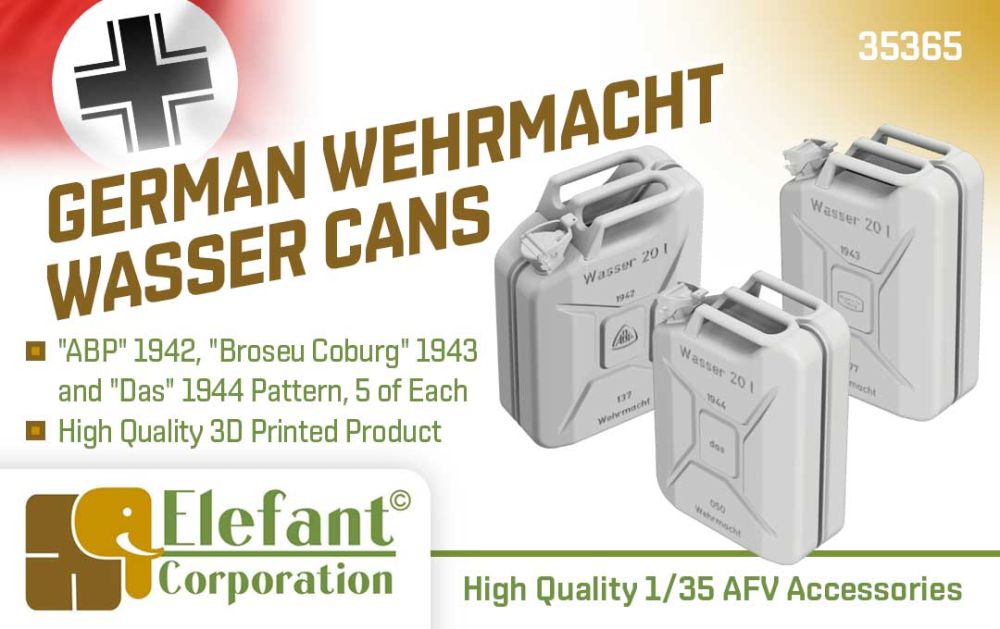 E35365 German Wehrmacht Wasser cans, "ABP" 1942, "Broseu Coburg" 1943 and "das" 1944 pattern, 5 psc. each